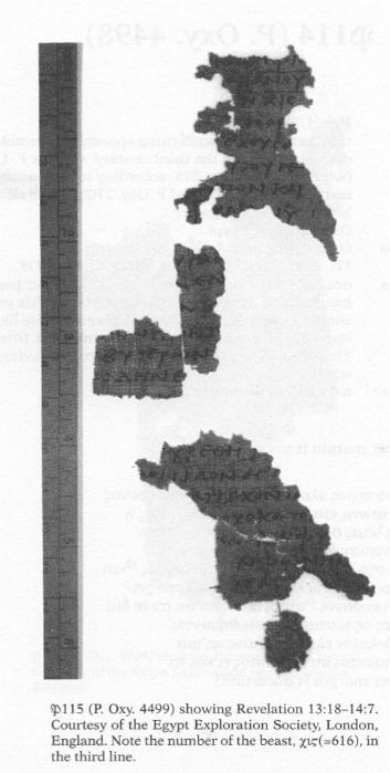 Según el Centro para el Estudio de los Manuscritos del Nuevo Testamento existen aproximadamente 400 000 variantes textuales. De estas variantes textuales sólo el 1% corresponden a verdaderos errores. Por ejemplo, hace unos años se encontró un fragmento que incluía un pasaje de Apocalipsis 13:18. El pasaje lee, “Aquí hay sabiduría. El que tiene entendimiento, cuente el número de la bestia, pues es número de hombre. Y su número es seiscientos sesenta y seis.” El papiro P115 es diferente pues lee 616 en lugar de 666. El papiro P115 es el fragmento más antiguo de este verso.